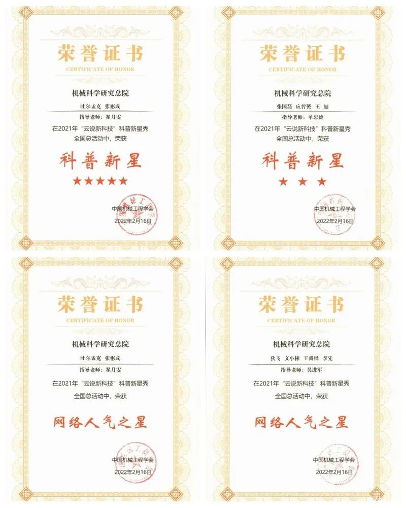 由中国机械工程学会主办,武汉理工大学、湖北省机械工程学会承办的2021年“云说新科技”科普新星秀落下帷幕。中国机械总院作为协办单位,通过前期选拔,报送全国总活动参赛作品6项,经过评审委员会审议、社会公众网络投票,我院机电所参赛作品《大载荷无模辗压成型设备》(创作团队:吐尔孟克、张彬成;指导教师:翟月雯)从86个作品中突出重围,取得第一名的好成绩,获得“科普之星”(五星)、“网络人气之星”称号;我院轻量化院和中机认检联队参赛作品《无模铸造》(创作团队:张国磊、应哲赟、王喆;指导教师:单忠德)获得“科普之星”(三星)称号;我院必威betway中国、轻量化院及江苏分院联队参赛作品《N95口罩你戴腻了吗?》(创作团队:狄飞、文小棒、王舜铎、李先;指导教师:吴进军)获得“网络人气之星”称号。