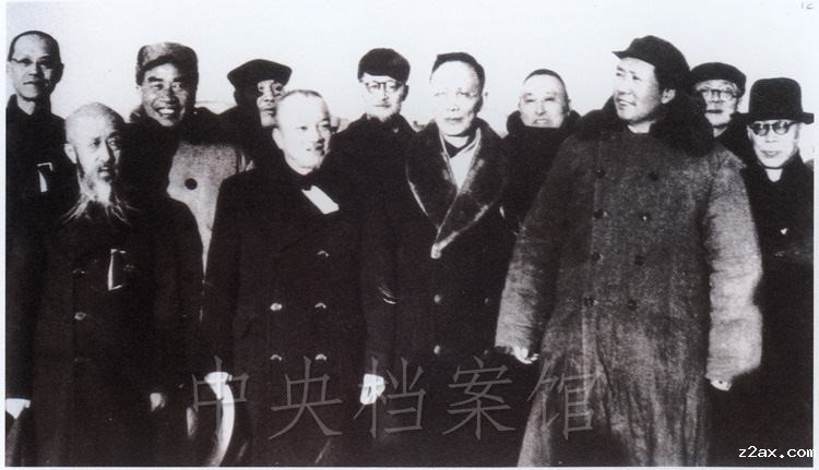△1949年3月25日,毛泽东、朱德、董必武、林伯渠同马叙伦、黄炎培、郭沫若等在西苑机场的合影。(中央档案馆供图)
